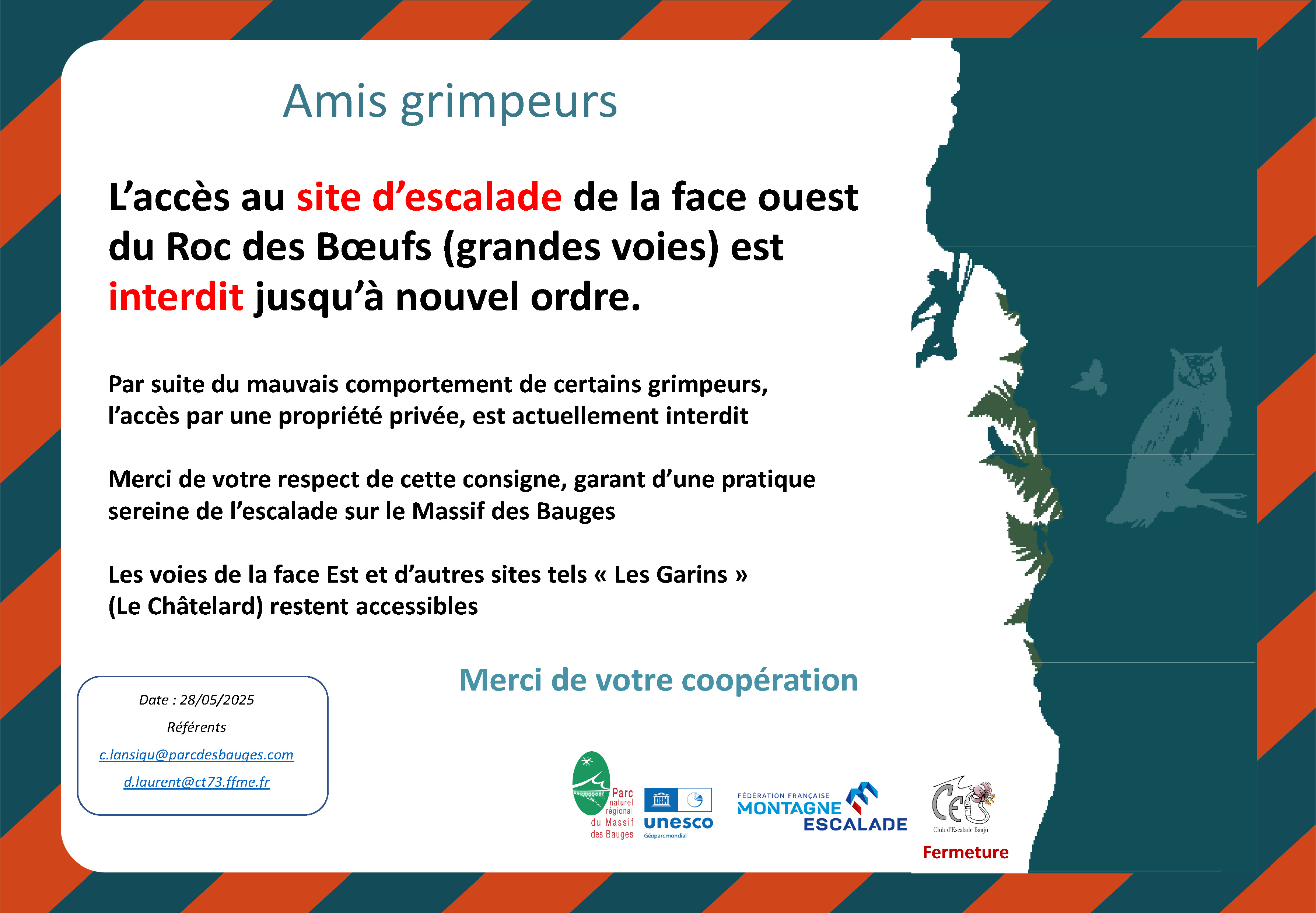 Pour faire suite à des incivilités de grimpeurs lors de l’accès au site du Roc des Bœufs (Face ouest), le GAEC « Les Chardons Bleus », propriétaire de l’alpage qui a été traversé, a manifesté un vif mécontentement et a fermé le site.