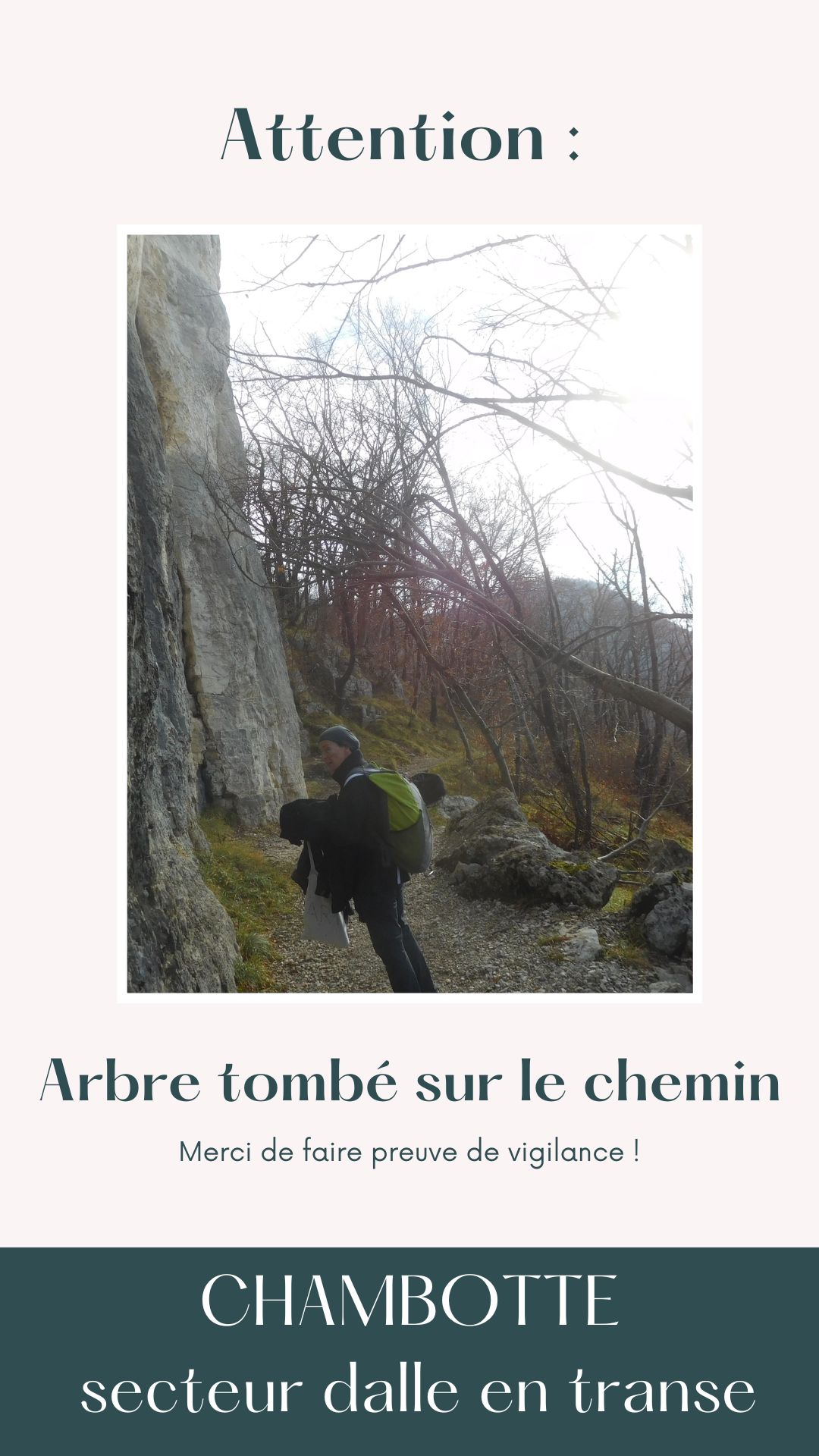L’arbre n’est pas sur le chemin, il est appuyé contre la falaise sur environ 3 plaquettes. Les voies entre « le bloc est un plat… » et « pourquoi pas » ne sont pas grimpables. On peut éventuellement faire « la voie de son maître » en démarrant dans « le bloc est un plat… » sur deux points. « Pourquoi pas, 6a » est grimpable, tout à droite. Ludo