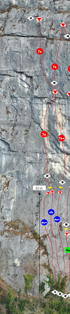 Du même départ plus à droite du dièdre. L2 6A L3 6C+/7A possible de la grimper en une longueur mais en fractionnant la descente.
