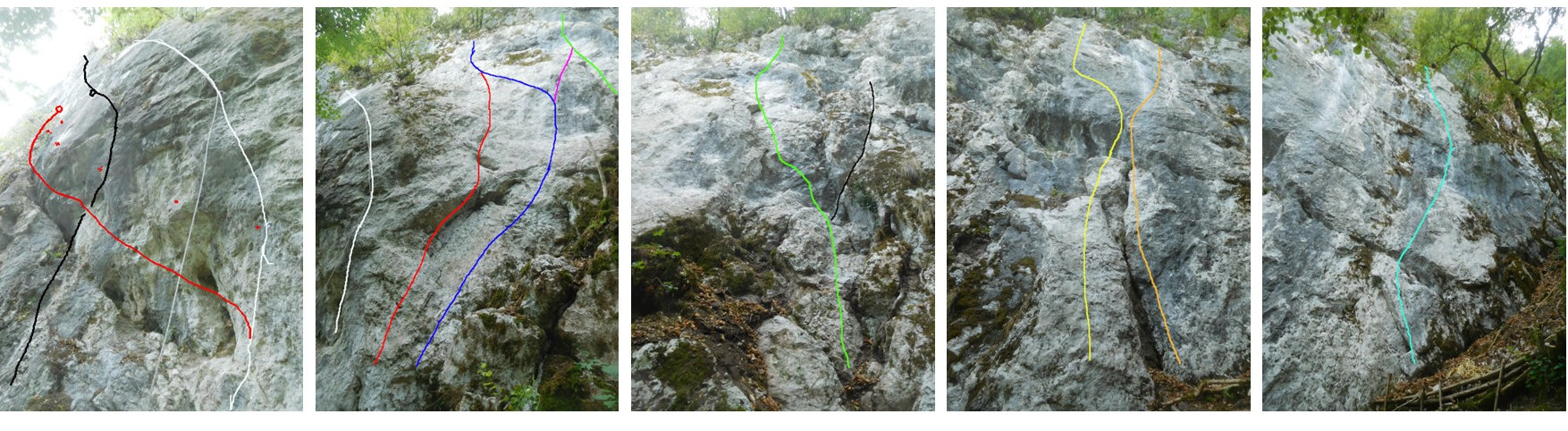 Noir : On a paumé Pépé – 6c (si on reste dans la fissure) sinon 6b en allant à droite (gros blocs) Vert : Reborn is Moron – 6b, à affiner